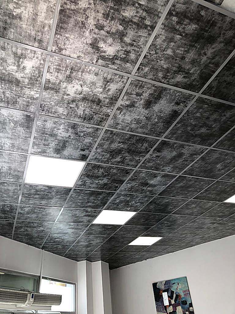 Arka Yüzü ve Kenarları Pvc Kaplı, Ön yüzeyi Fırınlanmış Ahşap Desen Lamineli Alçı Tavan Karosu Çevre alüminyum L profil, çevre duvarları üzerine hortum terazisi ile işaretlenen çizgi üzerinden dübel ve vida ile sabitlenir. Askı çubuklarının yerleri 120cm. aralıklarla tavanda (aydınlatma, seslendirme benzeri tesisatlar dikkate alınarak) yerleri belirlendikten sonra askı çubukları monte edilir. Ayarlanabilir çiftli yaylı maşa askı çubuklarına gerildikten sonra ana taşıyıcı T profili yaylı maşaya asılır. Karolajı oluşturan 120mm.\'lik ve 60mm.\' lik ara taşıyıcı T profillerin montajı yapılır. Ön Yüzeyi Fırınlanmış Ahşap Desen Alçı tavan karosu